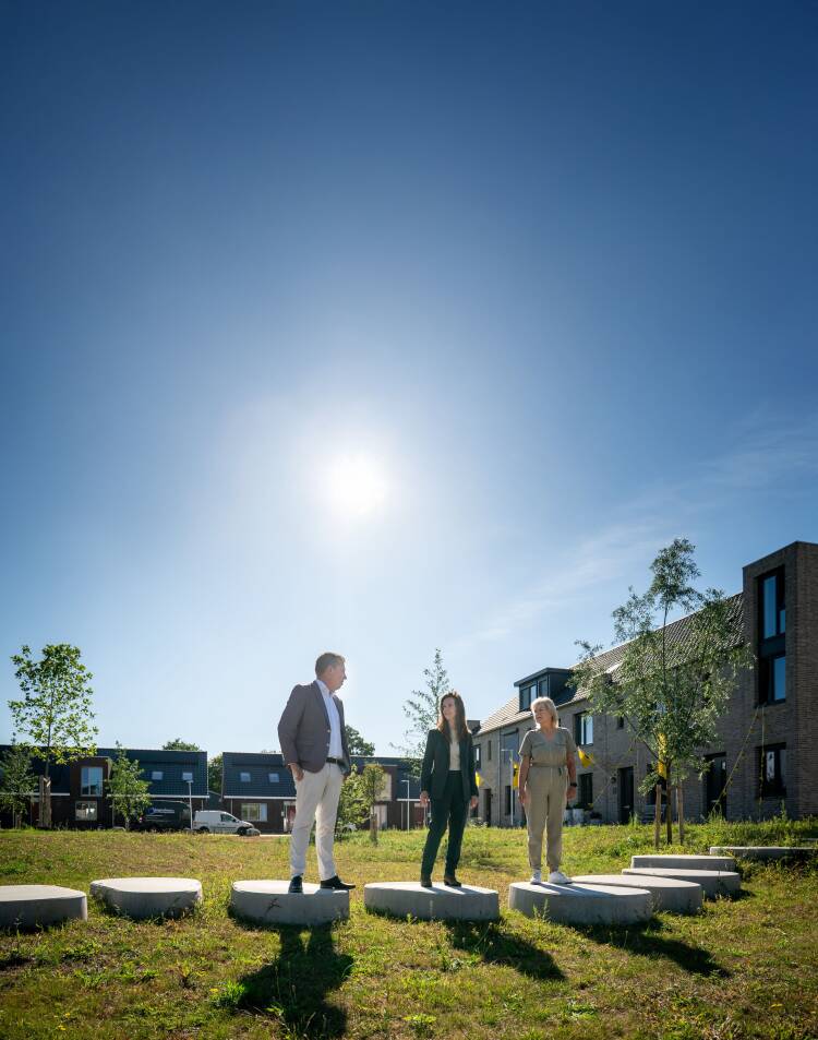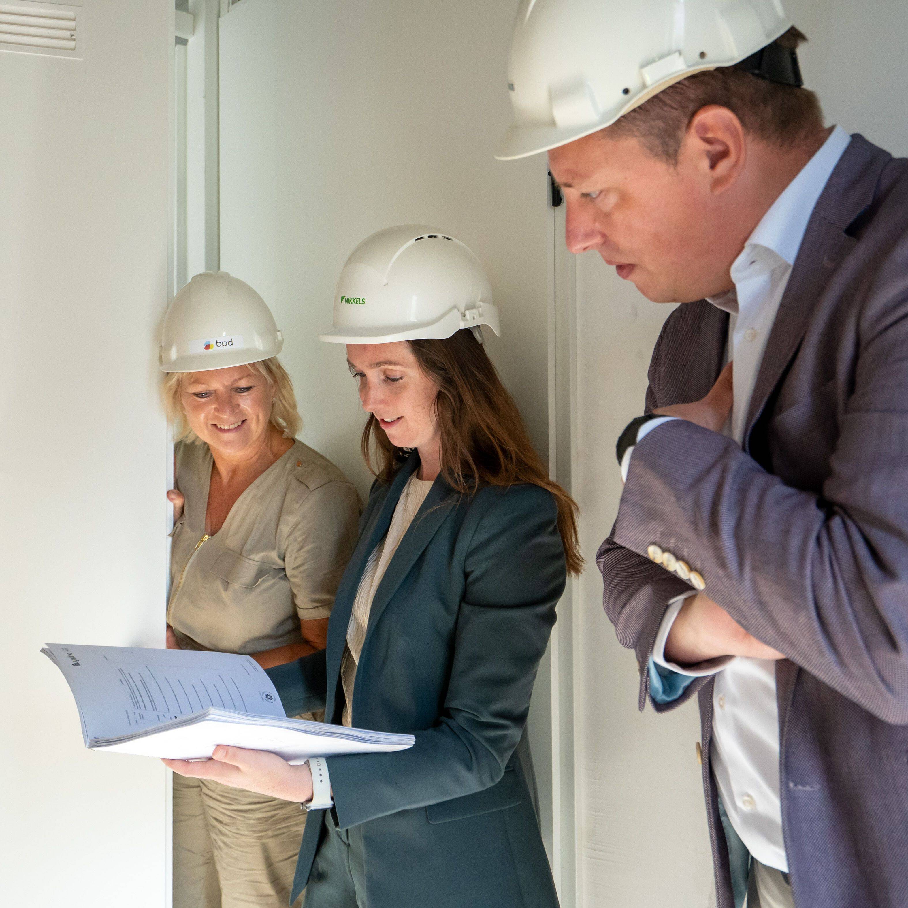 Verkoopmanager Esther de Jong – Gerressen van BPD, Accountmanager Dennis Solen van Huysinc en Kopersbegeleider Johanna Ek van Nikkels op het Douma-terrein in Raalte.
