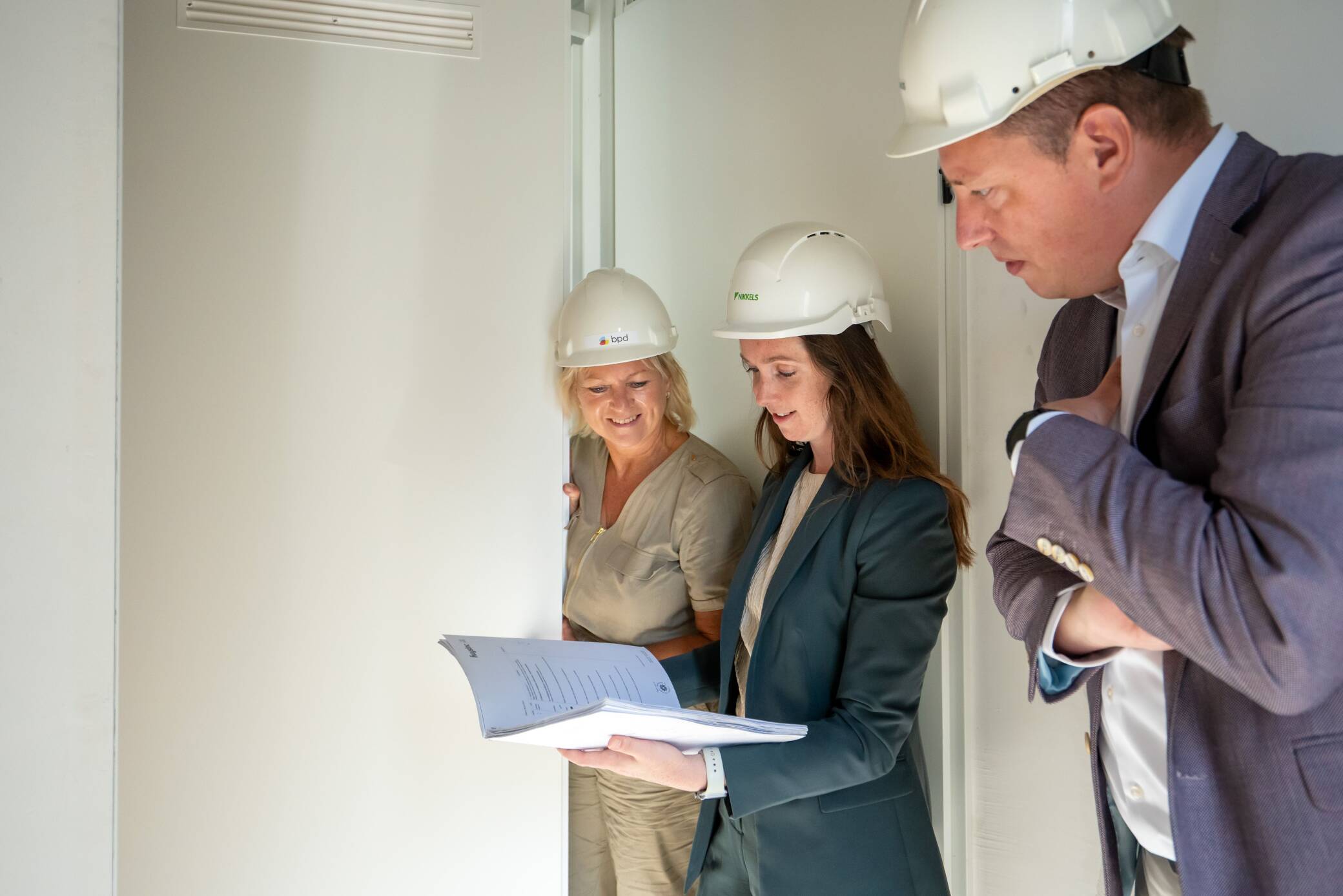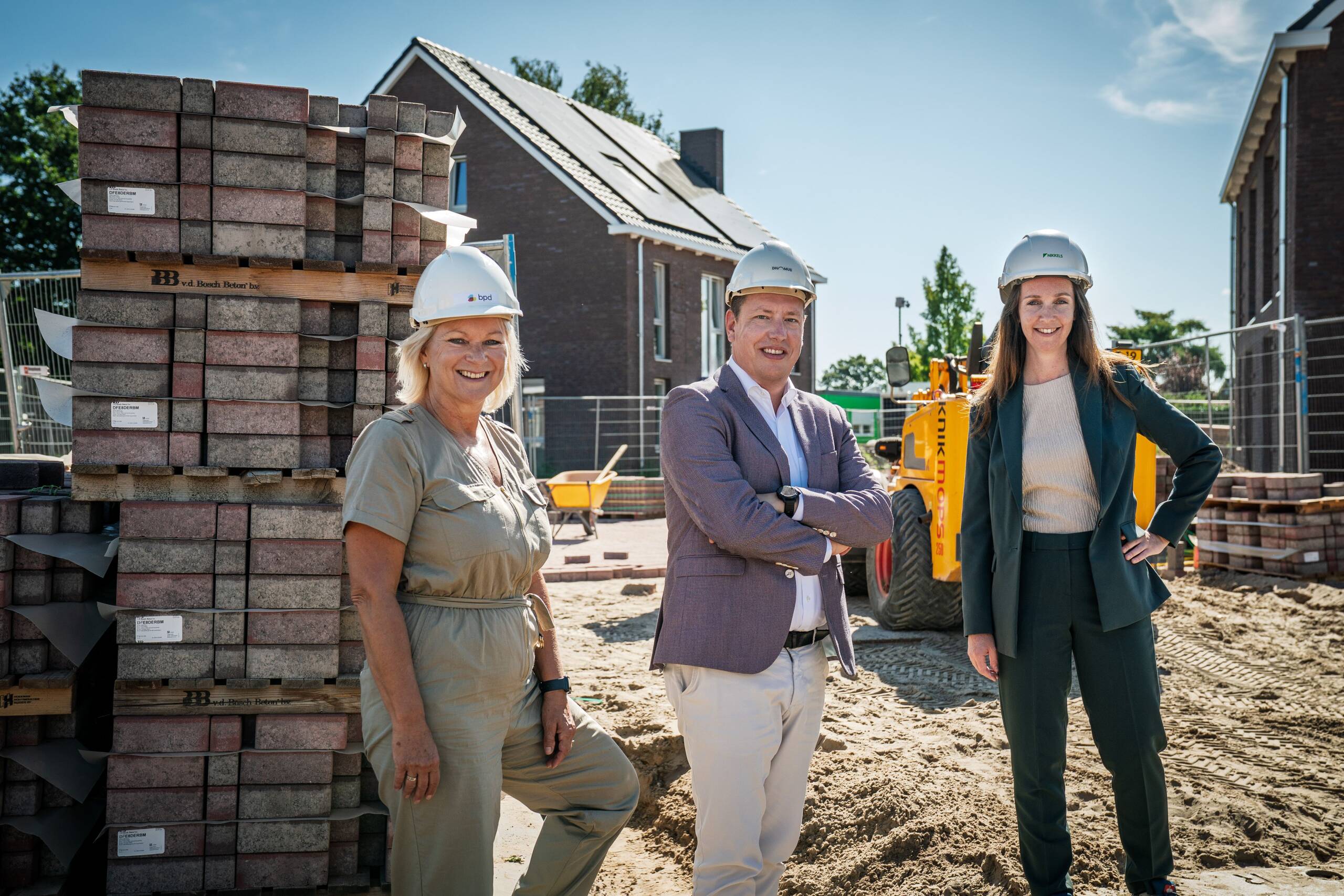 Accountmanager Dennis Solen van Huysinc, Verkoopmanager Esther de Jong – Gerressen van BPD, en Kopersbegeleider Johanna Ek van Nikkels op het Douma-terrein in Raalte.